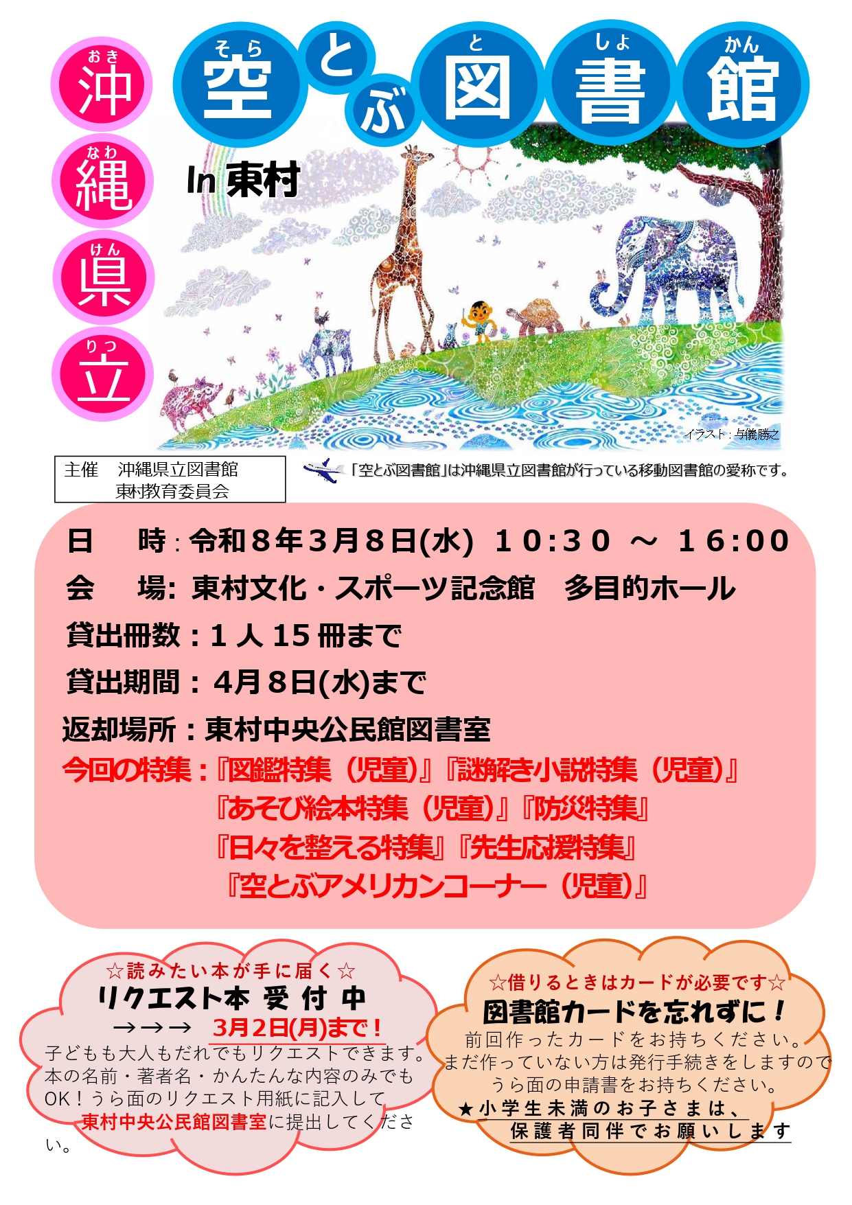 沖縄県立図書館では、主に離島や北部地域の住民のみなさまに読書機会を提供するため、町村教育委員会と連携し、空とぶ図書館(移動図書館)を開催しています。