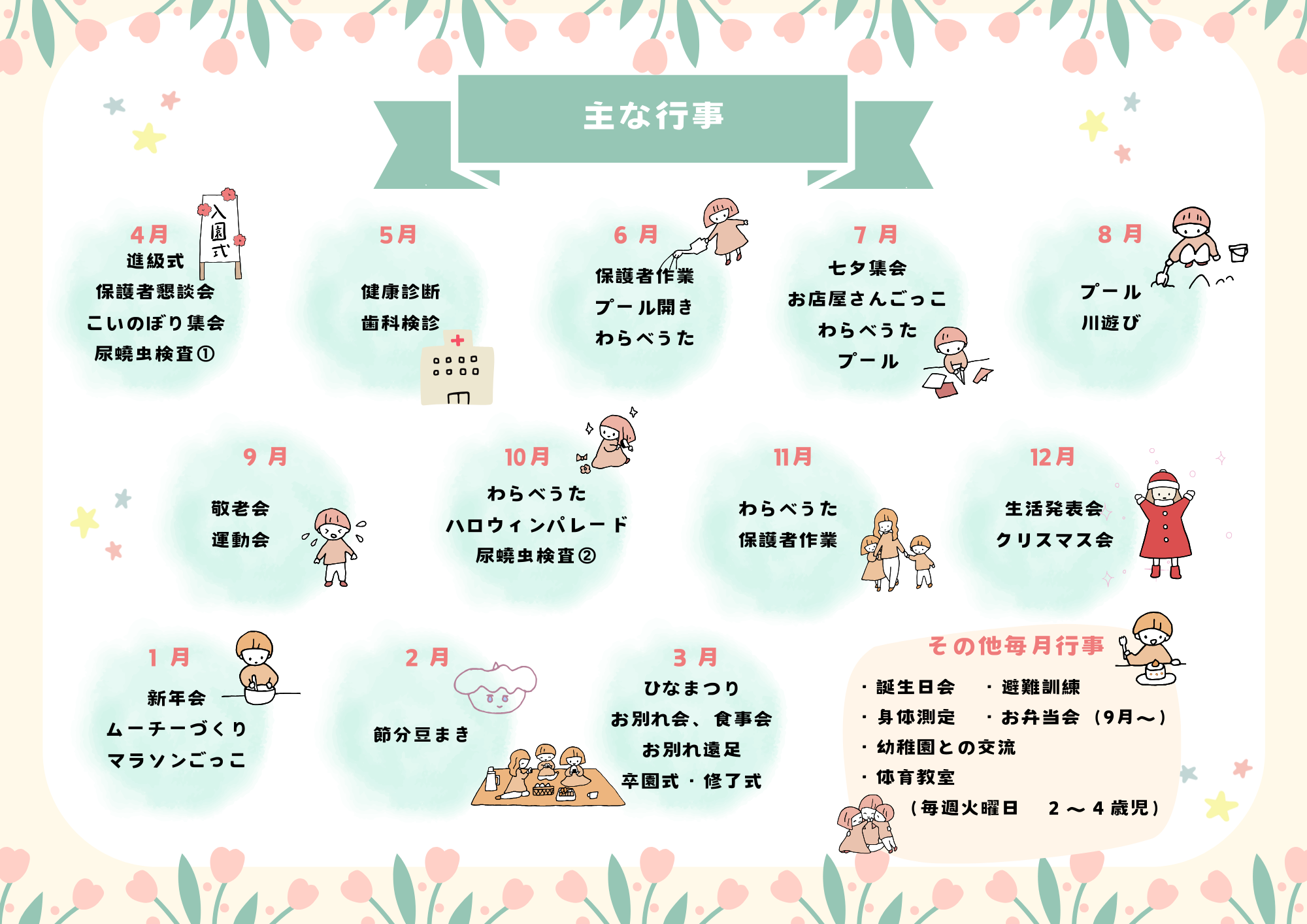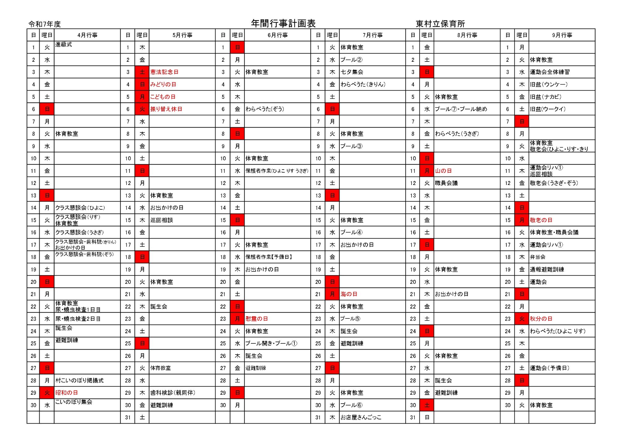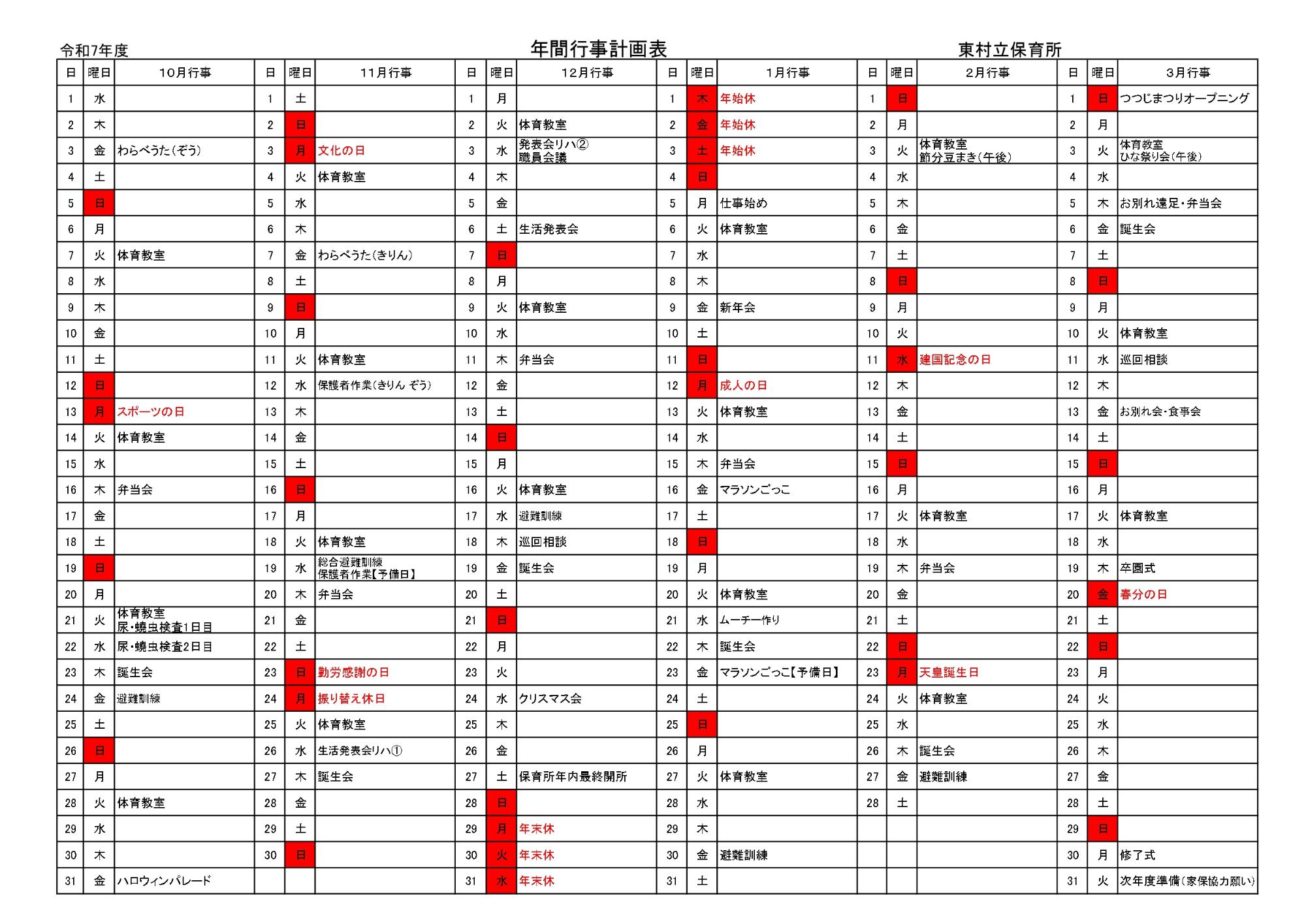 年間行事 Tweet 更新日:2025年12月09日 月ごとの行事 行事の様子 4月 こいのぼり集会 6月 プール開き 7月 お店屋さんごっこ 体育教室1 体育教室2 体育教室の成果(かな?) 誕生日会(タンカーユーエー) エイサーの練習 畑作業 年間スケジュール このページに関するお問い合わせ先 福祉保健課〒905-1292 沖縄県国頭郡東村字平良804番地電話番号:0980-43-2202ファックス:0980-43-3050