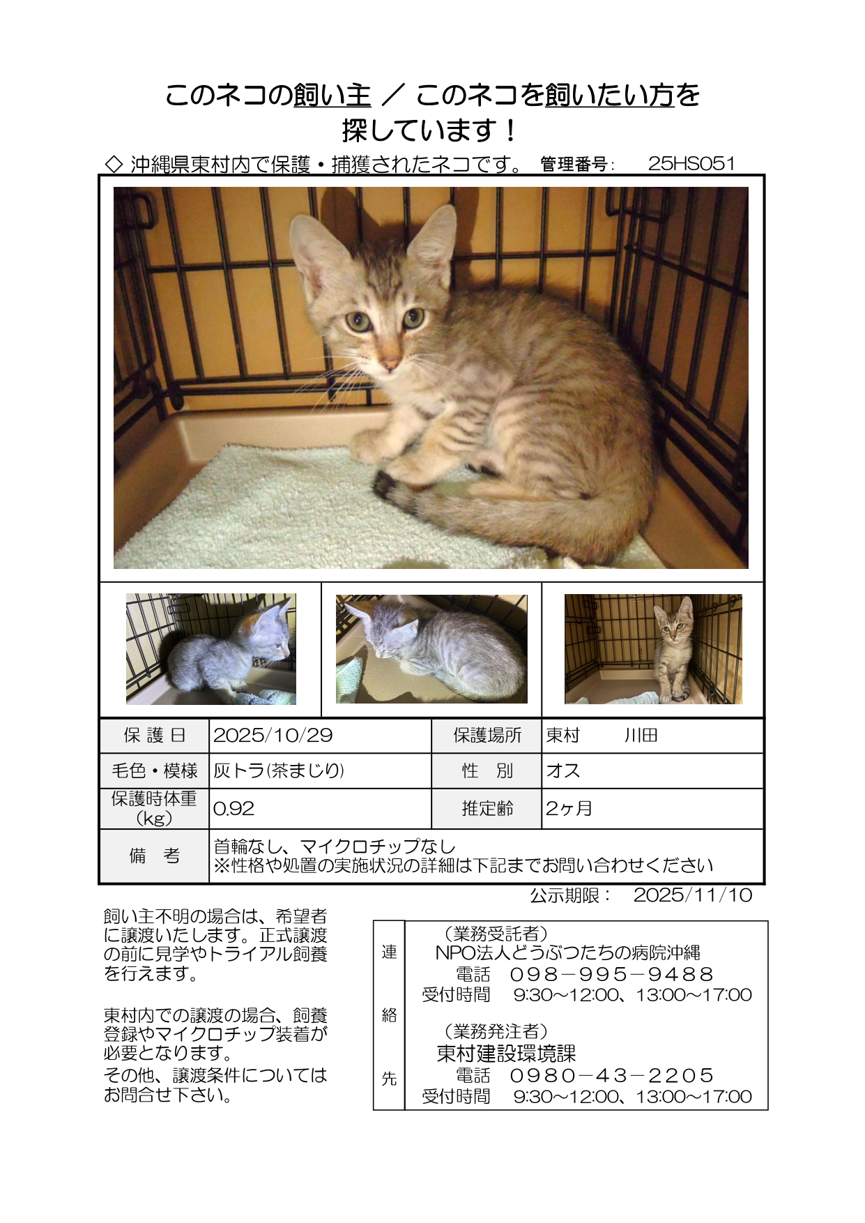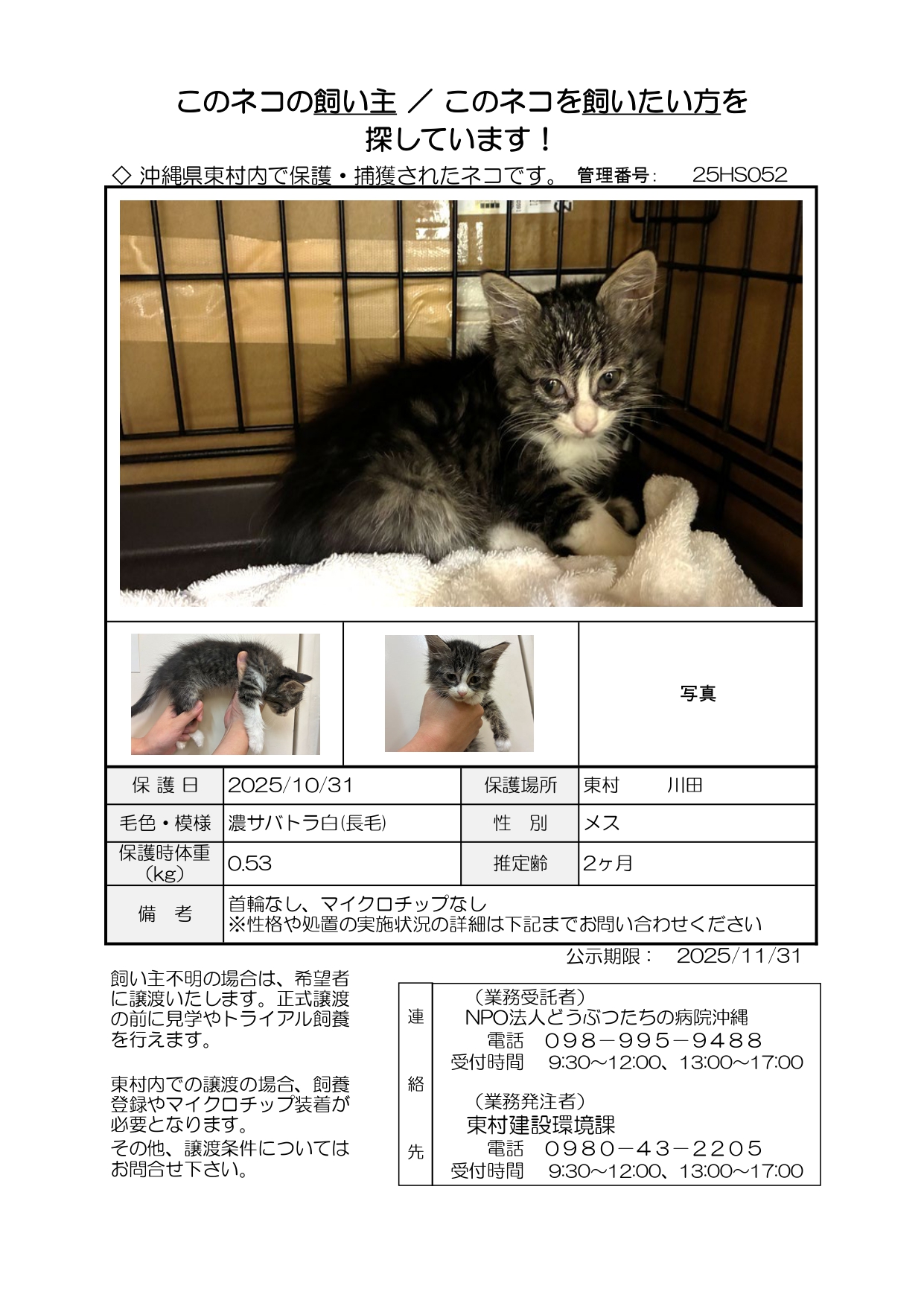 以下に、保護ネコの写真や最新情報が載っていなくても、里親や飼い主を捜していないというわけではありません。保護先で里親を探している場合がありますので、里親のご希望や飼い猫の質問などがあれば、建設環境課までお問い合わせお願いします。